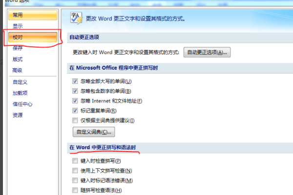 6、点击校对命令以后,在右边的界面框中对“word中更正拼写和语法时”的选项取消勾选;