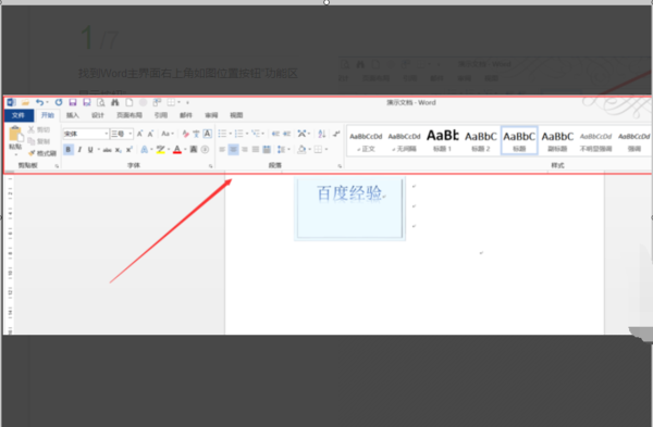 1、找到Word主界面右上角如图位置按钮“功能区显示按钮”。