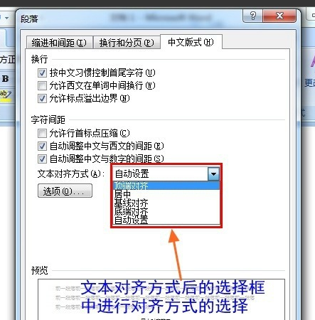 第四步:在“中文版式”界面的文本对齐方式后的选择框中进行选择。有四种对齐方式:居中、顶端、基线、底端对齐。