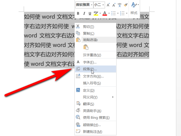 3、选中需要向右对齐的文字区域,然后点击鼠标右键,在跳出的工具栏中选择段落设置工具。