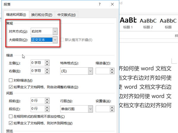 4、然后在段落设置中选择缩进和间距设置,在常规选项下将对齐方式设置成右对齐。