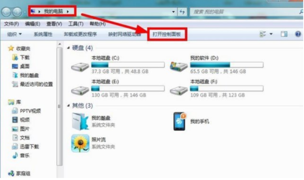 1、首先打开win7系统的“我的电脑”找到“打开控制面板”直接进入。