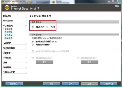 你打开“Norton Internet Security”,点击“设置”,点击“个人防火墙”,这里你可以选择“关闭”,然后选择停止的时间。就可以暂停诺顿了。点击“配置”,新界面就是配置的界面,在新界面点击“程序信任控制”,在这里你可以把一些程序加到信任区域 ..