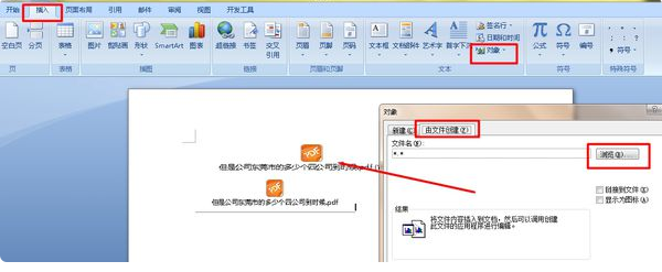 插入-对象-由文件创建-找到PDF确定-只能插入PDF图标及文件名,如下图