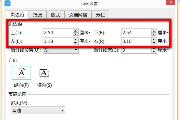4、点击了之后就进入到页面设置,在页边距里面将上下左边的边距的数值,上下超出范围就调整上下边距,左右超出范围就调整左右边距即可。