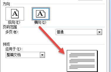 5、点击横向后,在右边的预览栏里就会见到word 当前页为横向打印的了。
