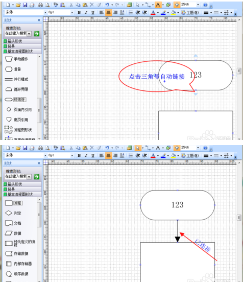 选中一个形状后其四周会出现小的三角号,点击后将会自动链接。