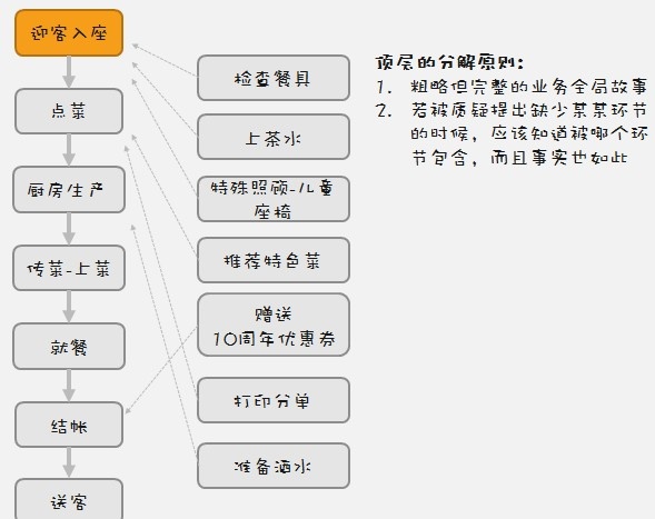 2. 包含该范围内的关键节点。并且,当被质疑说某某环节怎么不存在时,自己要清楚它在下一层分解中应该被包含在那个关键节点中。比如,赠送10周年优惠券,应该会在结帐节点分解中出现。而打印分单,会在点菜节点中分解。而准备儿童座椅应该是接待入座环节。