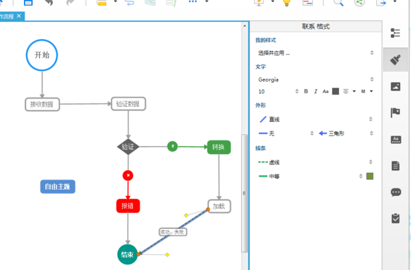 4.设置流程导向,点击你需要添加的箭头方向的主题,右击插入联系,然后点击你需要连接的另一个主题。修改联系线的格式,点击联系线,右击格式,或者左击一下,点击右边工具栏的格式。