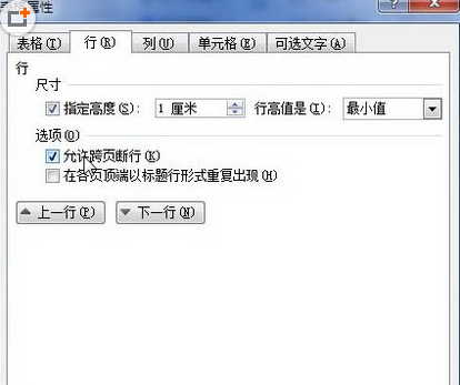 在“表格属性”对话框中单击“行”标签,进入到行设置中。