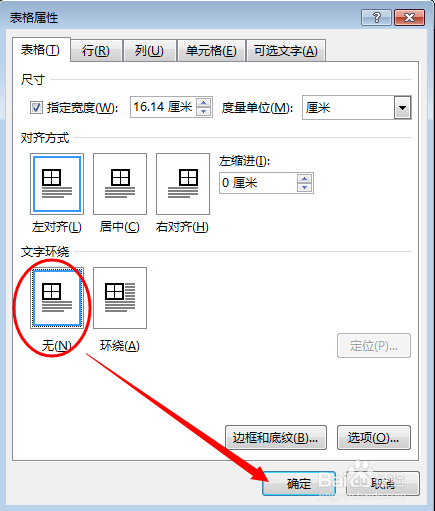 2、在弹出的“表格属性”对话框“表格”标签页下,将“文字环绕”设置为“无”,然后 单击“确定”即可。