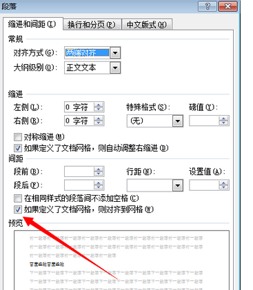 在打开的段落属性界面中,找到间距那一项,去掉“如果定义了文档网络,则对齐到网格”前面的勾。