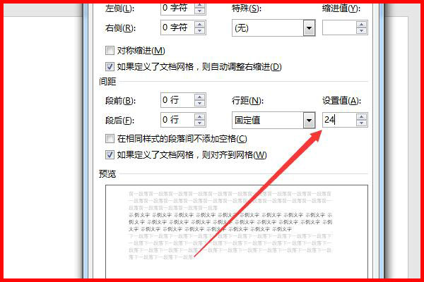 4、在设置值一栏中输入24,行间距即被设置为24磅。