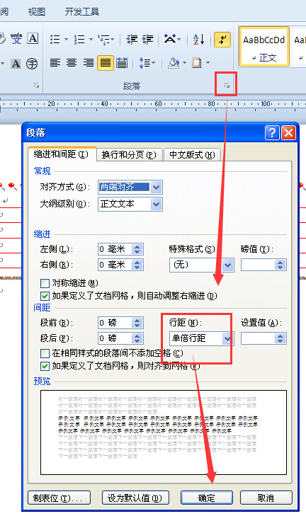 在打开的段落属性操作界面中,查看间距中的段前和段后是否设置了多少行,将数值调整为0行。然后再调整文字的行间距。