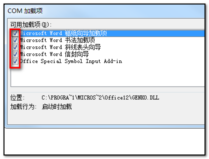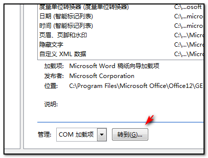 5、点击转到以后,在弹出的对话框中对可用的加载项取消勾选即可完成。