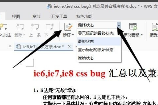 5.对于修订文档的显示方式也分为几种(红色标记内)。