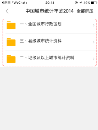 4、解压之后会列出里面所有的文件,点击相应文件,会提供相应的打开文件的选项。如果里面的是图片文件,则可以保存到相机胶卷中: