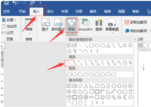 1、打开Word,点击“插入”选项卡下的“形状”按钮,选择线条中的“直线”。