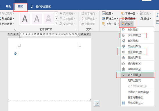 4、这样虚线就画好了,接下来调节位置。选中这条直线,点击菜单栏中的“格式”,选择“排列”选项卡下的“对齐”下拉框,分别先后选择“水平居中”、“垂直居中”、“对齐页面”,则就会在页面的正中间画出一条虚线。