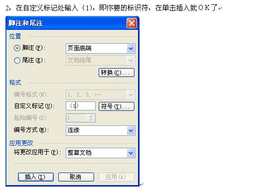 2,在自定义标记处输入(1),即你要的标识符,在单击插入就OK了(请见图片)