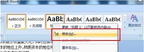 在“样式”中选定某个序列,比如我的一级序列即“标题1”的,右键点击。会出现一个菜单栏,选择“修改”。