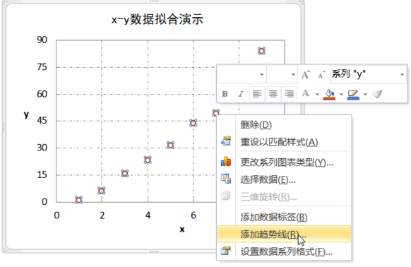 2.选中数据点→右击鼠标,在弹出菜单选择“添加趋势线”