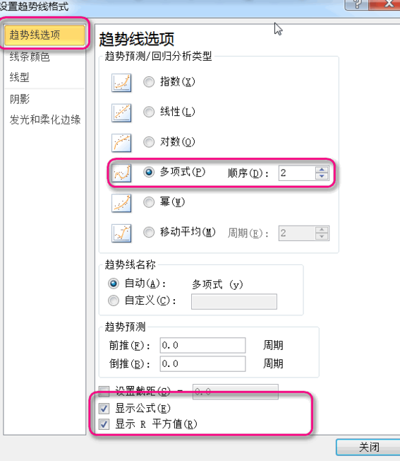 3.勾选显示公式的复选框。另外也可以设置趋势线的颜色、线型等,