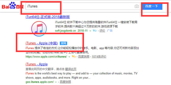 1、在电脑上面打开一个浏览器,在百度中输入“iTunes”,单击“百度一下”,选择“iTunes官网”打开