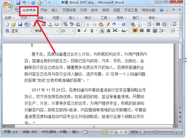 1、在电脑中打开目标word文档,然后点击“经典菜单”选项。