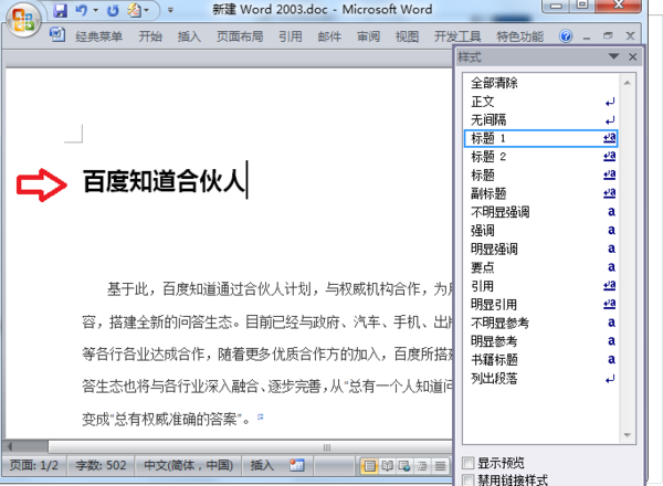 5、最后,把光标放到添加标题的文字前面,点击右侧的样式栏中相应的标题。