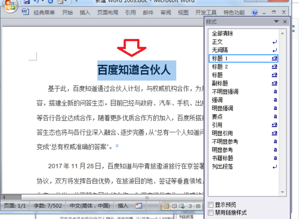 2、当你要设置一级的标题时候,选中该文字,点击标题1。