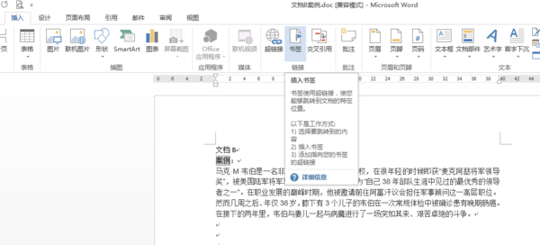 1、先在"文档B案例.doc"里要链接到的页面创建书签。选点位置——插入——书签。