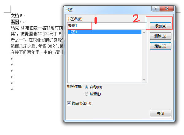 2,创建书签B:输入书签名,然后单击“添加”。
