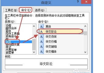 打开“自定义”对话框,在“命令”选项卡中单击“字体”,右侧“命令”中会显示计算机装有的所有字体,这可以选择常用的字体,如“ 华文彩文”,按住鼠标左键拖动其字体到工具栏中某个位置(根据自己实际选择存放位置哦)。