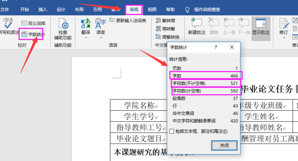 步骤三:然后在word文档中,会弹出字数统计的窗口,可以看到字数、页数、段落数、行数等更多详情了,查看过后点击关闭。