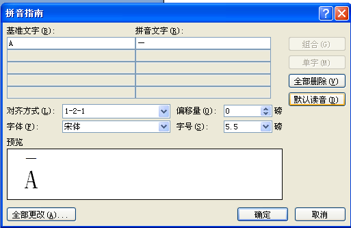 3、弹出拼音指南对话框,在拼音文字处输入—;(先插入—,选中后复制,在这里粘贴);