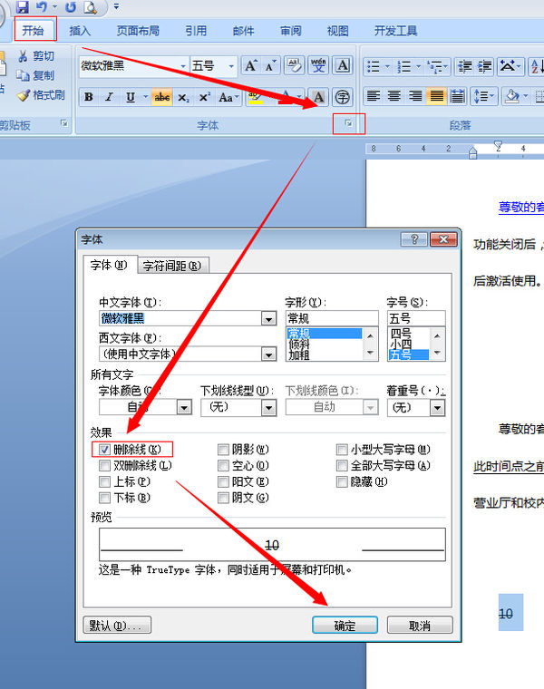 3、弹出字体对话框,在效果处选中删除线,如图所示;