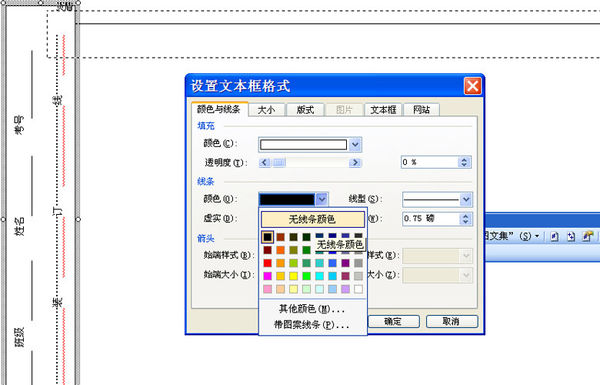 ? 2、先点一下“文本框”图标,然后鼠标单击虚线处,出现文本框,输入“密封线内不准答题”,选中,右键,文字方向,竖排,确定,右键文本框,设置文本框格式,无填充颜色,无线条颜色,确定