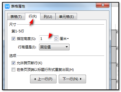 4、点击表格属性以后,在弹出的对话框中选中行,并在下方的选项框中输入数值;