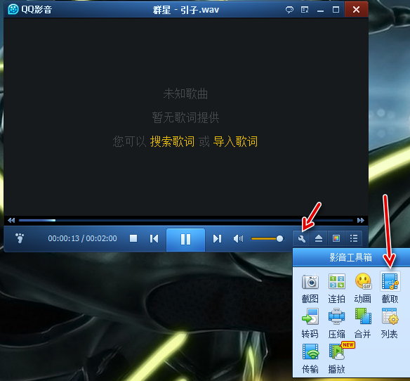 2: 正常播放音乐文件,当播放到需要剪切的地方时,点击播放器右下方的“扳手”图标,在弹出的工具箱中点击“截取”.(图2)