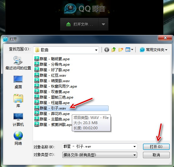 1: 启动QQ影音,点击【打开文件】,浏览到需要剪切的WAV文件;(图1)