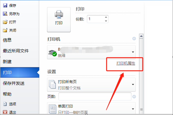 2、在右边弹出的打印设置里,点击“打印机属性”;