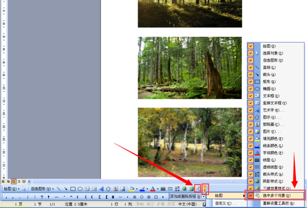 1、点击“绘图”最右侧的小三角,在下拉菜单中依次找到“绘图”——“选中多个文件”,并将“选中多个文件”前面的勾给勾选上。勾上后,在绘图工具栏上就会出现一个“选中多个对象”的小图标。