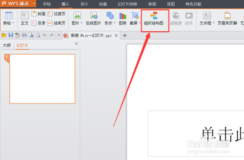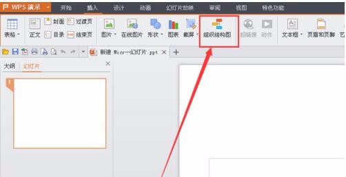 第二,在wps演示的上方,找到【插入】菜单项,并点击【组织机构图】。