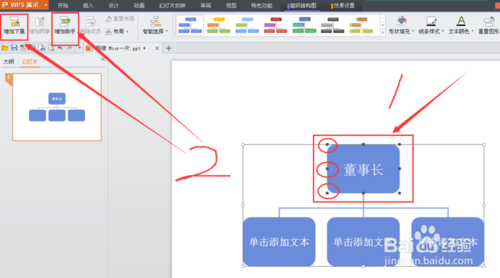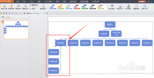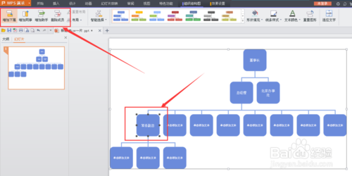 3、组织结构图出现后,可以调整布局,颜色的选项,根据组织架构的规范调整即可。