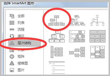 2、在打开的“选择smartart图形”对话框中选择“层次结构”,并选择一种图样。