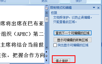 2)弹出“限制格式和编辑”的标签页。此标签页也提示文档受保护,以防止误编辑。