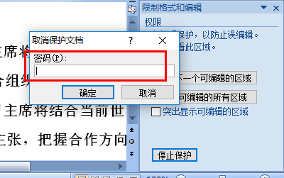 4)弹出"取消保护文档"提示框,输入保护密码。停止保护
