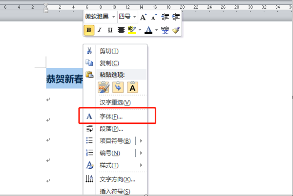 1、以Word2010版本为例,如下图,首先选中要加着重号的文字,然后点击鼠标右键,在弹出框里选择“字体”;