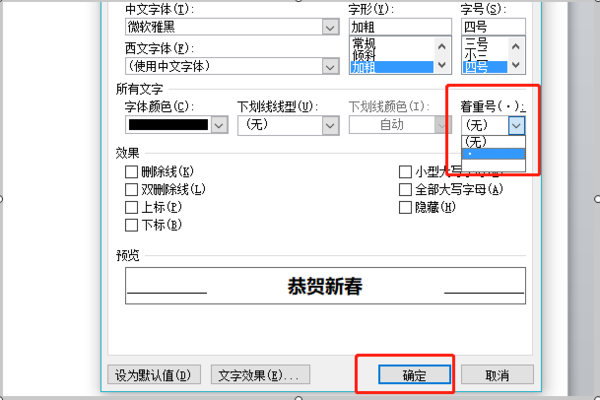 2、在弹出的字体设置框里,点击着重号右边的倒三角图标,在弹出框里选择着重号的符号,最后点击下面的确定;